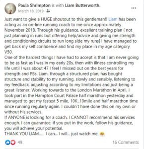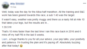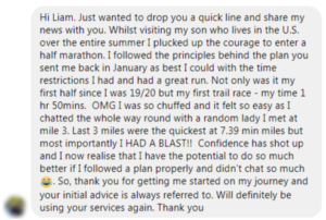 This time last year I was miserable, injured and sitting on the sidelines unable to do what I loved, with no idea how to fix it. Now, I'm in a much better place! I'm just about to run a half-marathon, it's a massive milestone for me and one that wouldn't have happened without the great coaching Liam has given me over the past year.